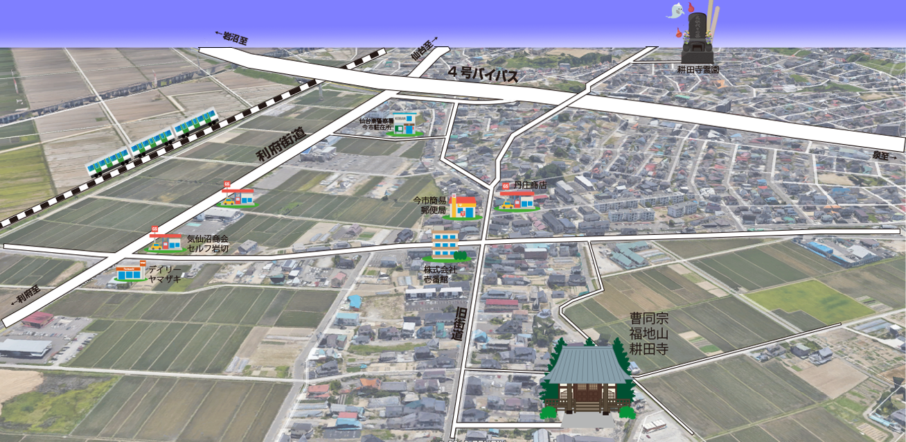 当寺(福地山 耕田寺)は、仙台市青葉区北山の金剛宝山 輪王寺を本山とする末寺であり、岩切・今市街道筋の新田開発と地域の発展に尽力された兵藤大隅信俊公と、今市足軽102人の菩提供養のために開山された寺院です。