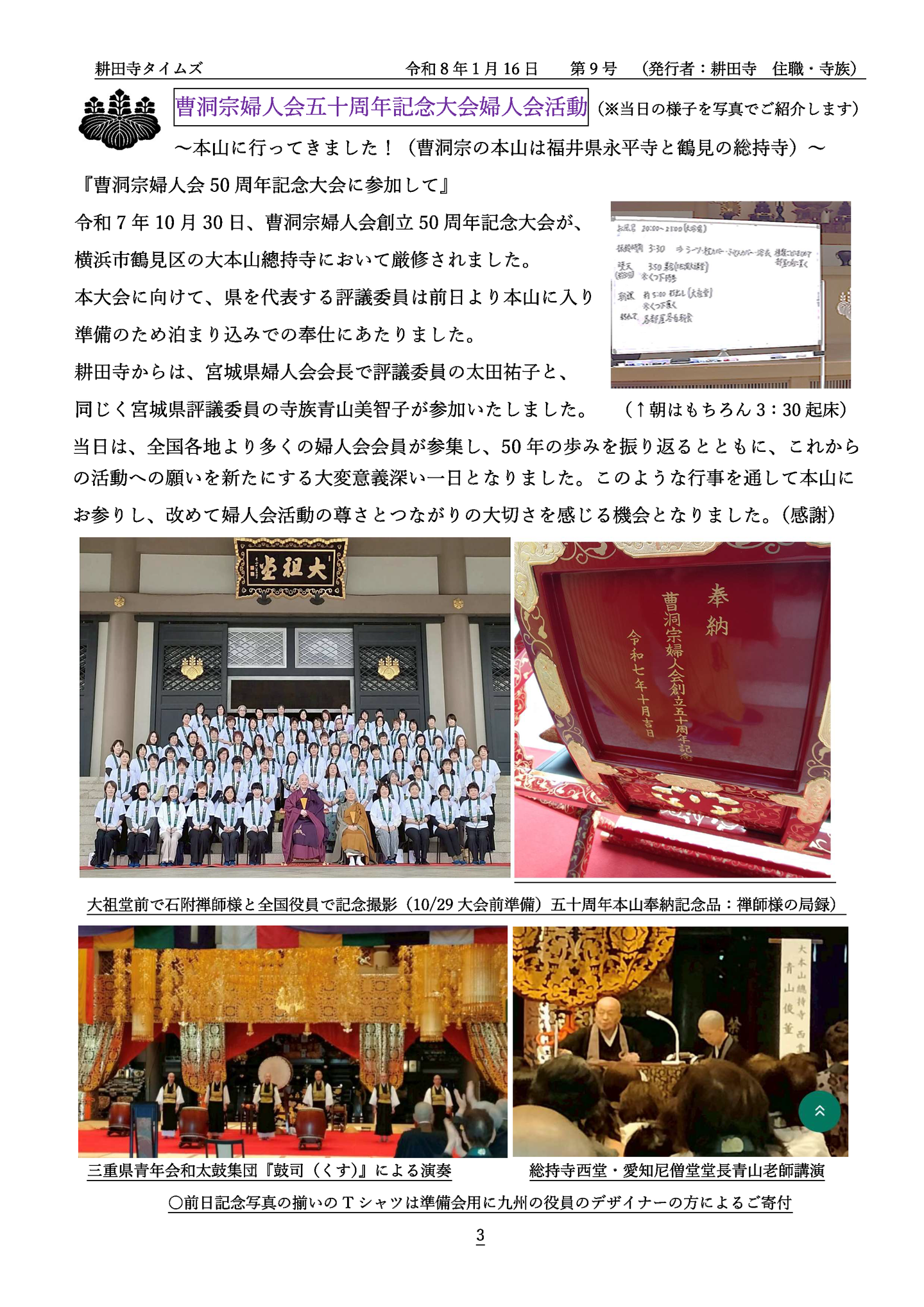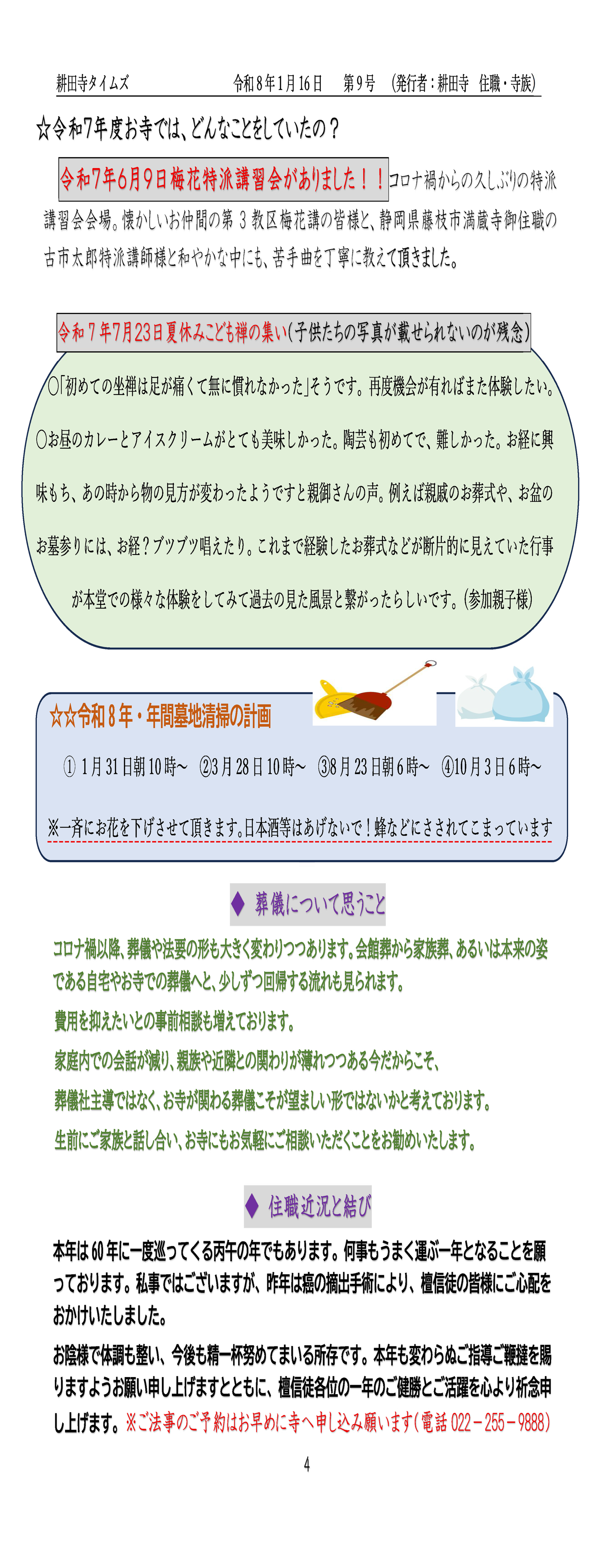 ホーム/耕田寺タイムズ/ 令和8年1月 第9号 耕田寺タイムズ 令和8年1月 第9号 2026年01月 前のページへ 次のページへ ホーム お寺のひとこま 檀信徒へお知らせ 耕田寺について 歴史 福地山 耕田寺 境内の案内 霊園の案内 曹洞宗 お唱えの仕方 お問い合わせ