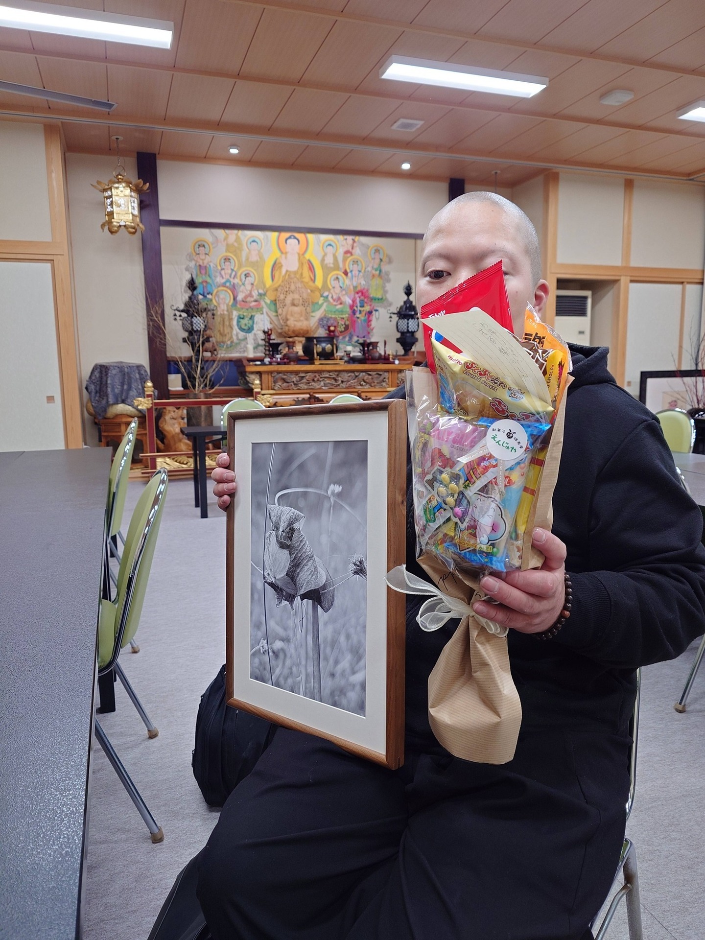 まずは寺の玄関にて、堂長様より頂いた写真を大切そうに皆さまへ披露し、その後、本堂にて帰山のご報告のお参りをいたしました。広間では、お茶を囲みながら、ひととき和やかにお話しする時間を持つことができました。
