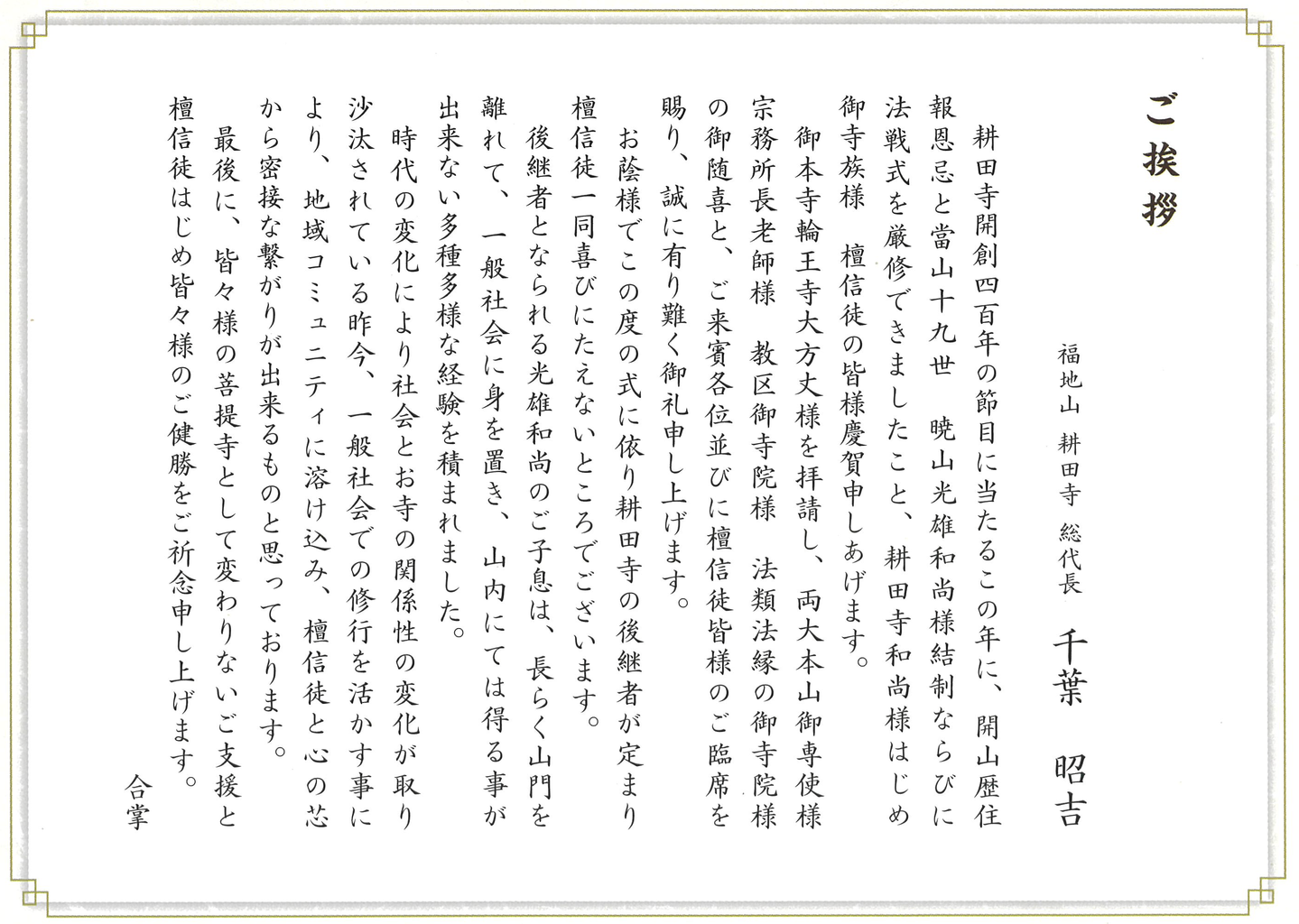 永い年月にわたって、皆様のお家と菩提寺であります耕田寺をお守り頂いて来られた ご先祖様方に、報恩と感謝の「まこと」を捧げる法要となります。