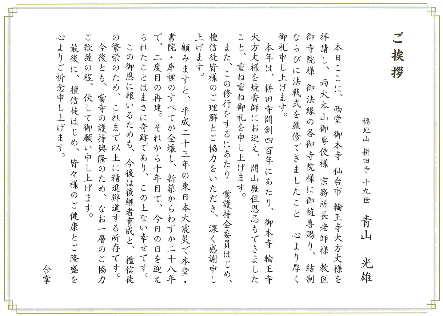 県内外から御縁のある御寺院様にご随喜賜り心配していた雨も、晴天に恵まれ無事円成できました。皆様に感謝申し上げます。