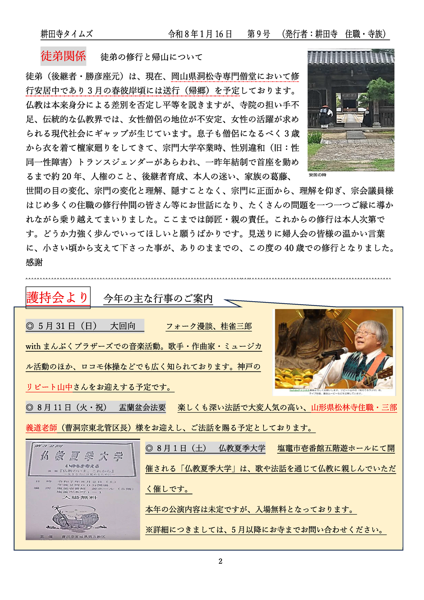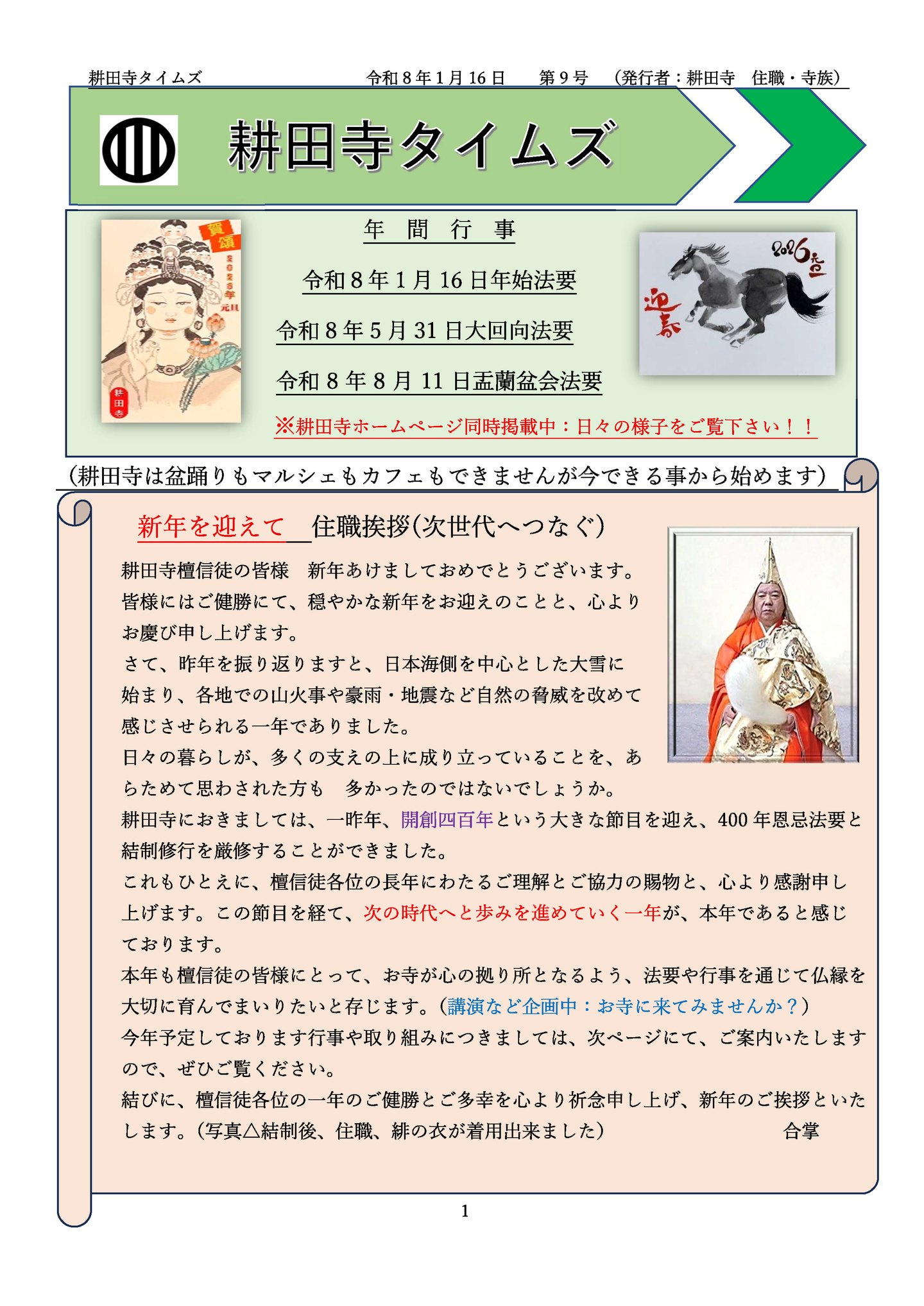 ホーム/耕田寺タイムズ/ 令和8年1月 第9号 耕田寺タイムズ 令和8年1月 第9号 2026年01月 前のページへ 次のページへ ホーム お寺のひとこま 檀信徒へお知らせ 耕田寺について 歴史 福地山 耕田寺 境内の案内 霊園の案内 曹洞宗 お唱えの仕方 お問い合わせ
